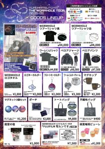 「THE WORMHOLE TOUR」グッズ決定!! 2025年11月10日更新 | カテゴリー:コンサートツアー 「THE WORMHOLE TOUR」グッズ決定!! 荒井由実と松任谷由実の出会いをイメージしたビジュアルを展開。WORMHOLEの世界観を醸し出したアイテムを取り揃えています。 ユーミングッズ初のキャラクターにも注目! 各会場で開場時間前に、先行販売を予定しております。 開場時間の1時間半前〜予定(会場により異なりますので、事前の告知にてご確認ください。) 開場中、終演後は売り場が大変混雑しますので、ぜひ先行販売をご利用ください。 ※グッズの通信販売については決まり次第ご案内いたします。 関連記事: ●「Wormhole / Yumi AraI」初回限定盤 特典映像収録内容決定(2025年10月22日) ●オリジナルアルバム「Wormhole / Yumi AraI」発売決定!全国ツアーの詳細&アルバム早期予約特典発表!(2025年7月24日) ●「THE WORMHOLE TOUR」ツアー会場限定『Wormhole / Yumi AraI』購入者特典決定!(2025年11月5日)